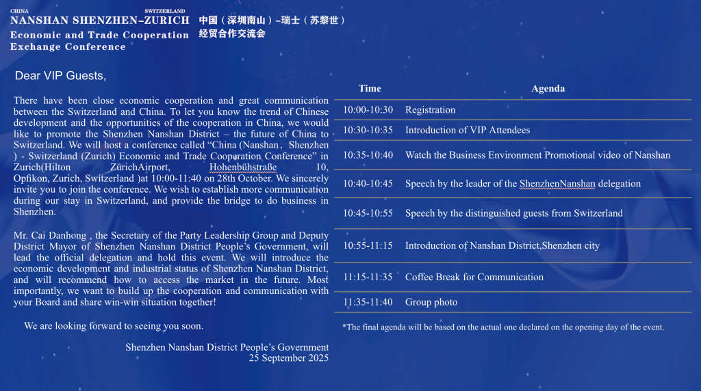 The Shenzhen Nanshan District People’s Government, in partnership with KUU China, cordially invites distinguished Swiss business leaders to an exclusive economic exchange conference. This invitation-only event offers direct engagement with senior Chinese government officials and provides strategic intelligence on China’s premier innovation district.This is a complimentary event with limited seating. Registration is by invitation only.